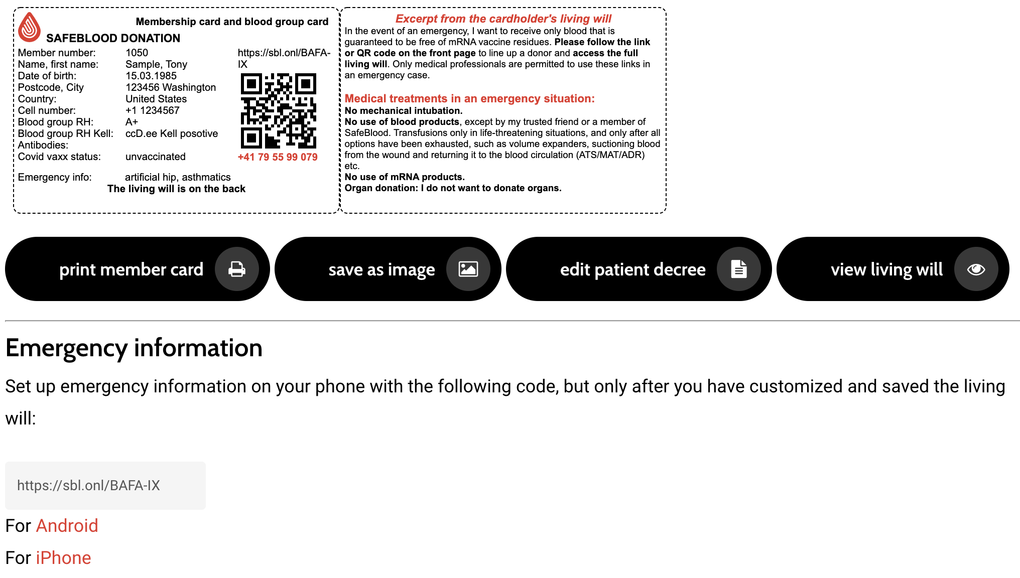The QR code and link above is also for emergency medical personnel. scanning this code/link will take them directly to your living will and all relevant medical data, in a special version only for professionals, who will find there the option to translate this data into the main world languages in a few seconds.