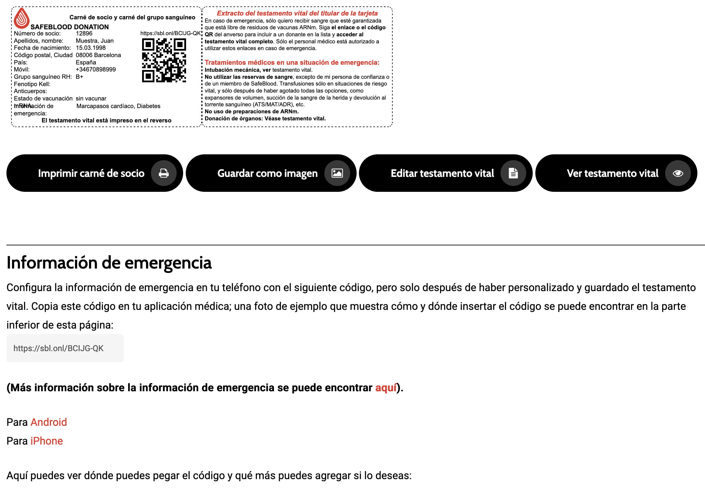 El código QR y el enlace anterior también son para el personal médico de emergencia. Escanear este código/enlace los llevará directamente a tu testamento vital y a todos los datos médicos relevantes, en una versión especial solo para profesionales, donde encontrarán la opción de traducir estos datos a los principales idiomas del mundo en pocos segundos.