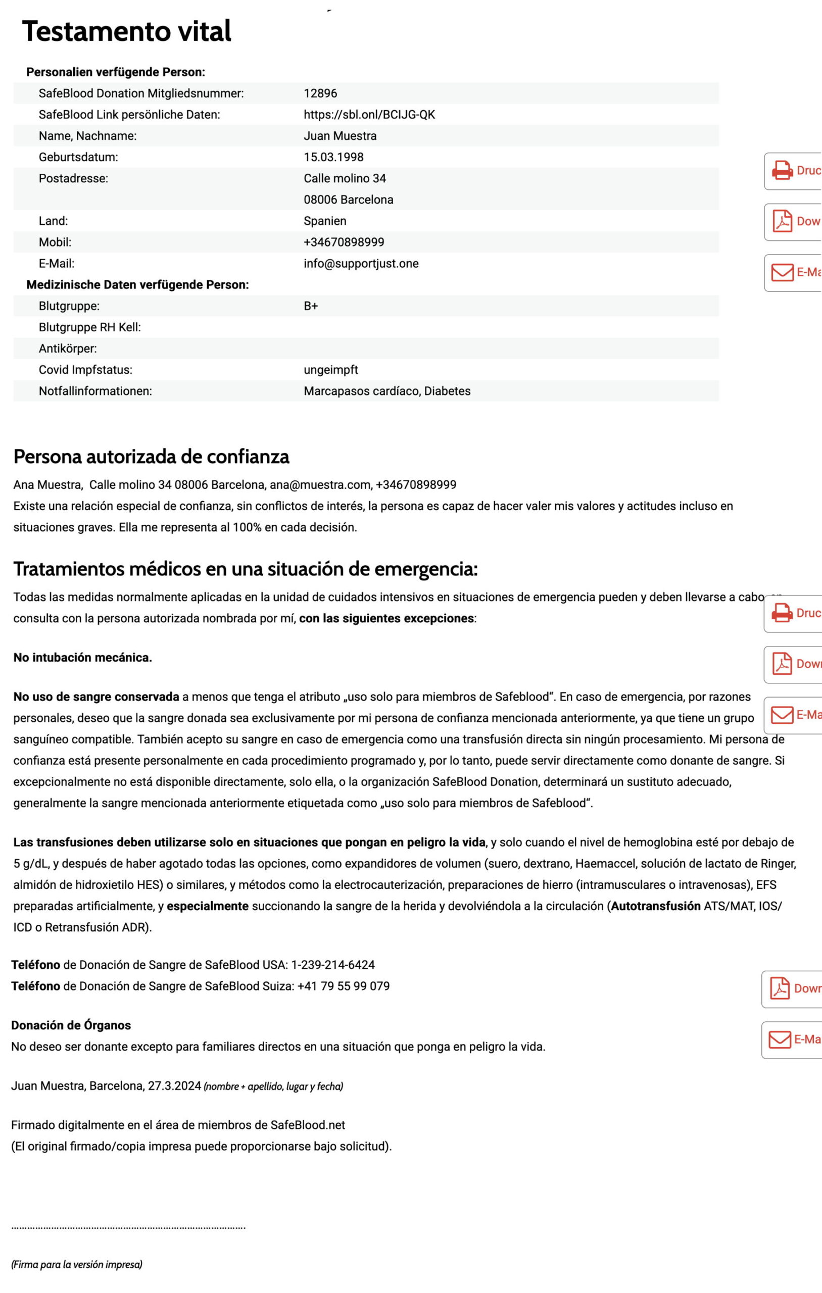 Este es un ejemplo de un testamento vital. Si deseas el tuyo propio, ve a Iniciar sesión como miembro aquí, donde puedes modificar este ejemplo como desees. O puedes hacerte miembro aquí. Entonces, no solo tendrás tu propio testamento vital y tarjeta de identificación de miembro/grupo sanguíneo, sino también un código individual que el personal médico puede consultar en caso de emergencia, con todos tus datos médicos.