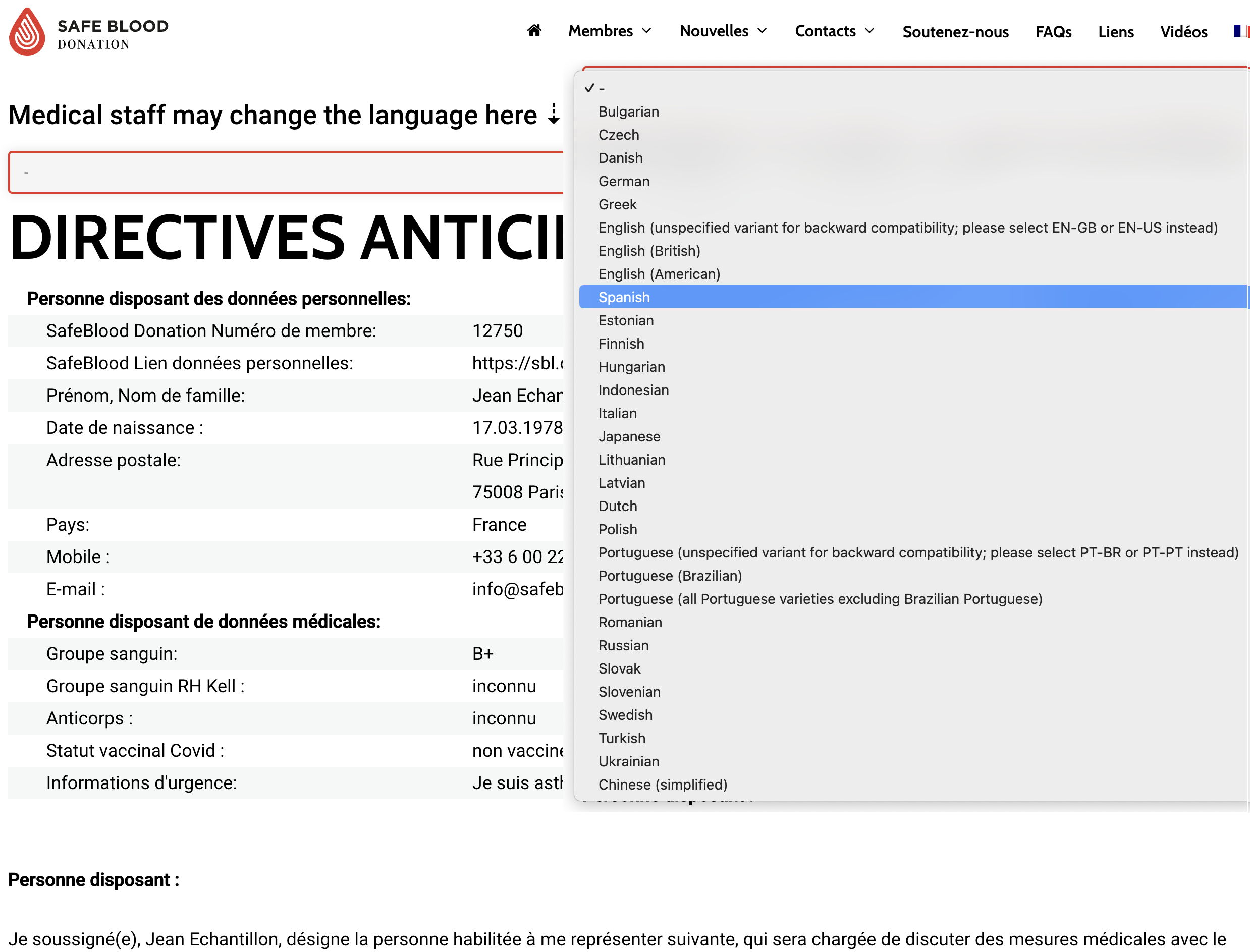 Un avantage important est que le personnel soignant peut traduire ces informations d’urgence directement sur le site web dans toutes les langues courantes du monde en quelques secondes (image de droite). Vous êtes ainsi assuré d’être traité de manière adéquate dans le monde entier.